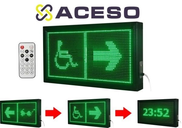 Модель одновременно отображает 2 пиктограммы, укомплектована ИК пультом, который позволяет дистанционно включать и выключать световой маяк, запускать необходимую программу (заранее загруженную).Удобно использовать если маршруту МГН периодически меняют направления например через зимний и летний вход в здание, ели есть необходимость удаленно менять отображающие пиктограммы на маяке. Так же в данную модель встроена возможность индикации времени и отображения коротких текстовых сообщений.