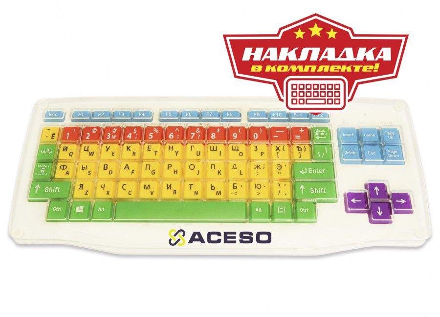 Данная клавиатура с большими кнопками дополнительно комплектуется специальной рамкой-накладкой, дополнительно служащая барьером для двойного нажатия крупных клавиш у людей с нарушениями моторики рук. Накладка для клавиатуры выполнена из безопасного прозрачного пластика.