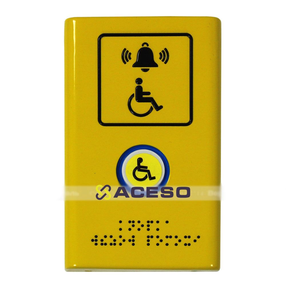 Поверхность кнопки имеет тактильное изображение знака инвалид колясочник, а так же надпись с применением системы Брайля «ПОМОЩЬ». Кнопка имеет сенсорную поверхность и срабатывает при касании тактильной зоны. При касании кнопки происходит подсвечивание зоны касания синим цветом. Коммутируется по беспроводному каналу связи с приемниками сигнала ПС-1099, ПС-1999 и ПС-999.