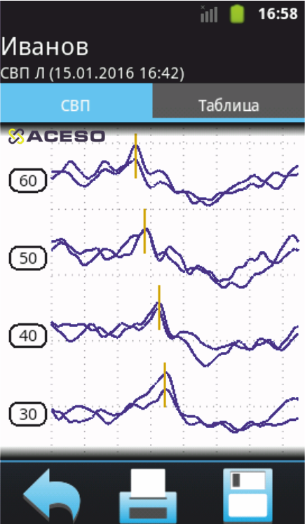 Регистрация КСВП необходима для уточнения диагноза в случае получения у пациента результата «НЕ ПРОШЕЛ» при скрининговых исследованиях. Используя «Аудио-СМАРТ», можно выполнить и этот тест. С его помощью вы можете записывать КСВП-кривые при различных интенсивностях стимула в одном обследовании, устанавливать маркер V пика для измерения латентности, генерировать таблицу зависимости между латентностью и интенсивностью. Для большего удобства «Аудио-СМАРТ» позволяет автоматически переключать электроды в зависимости от стороны стимуляции при использовании монтажа с расположением электродов на сосцевидных отростках.