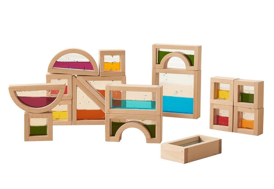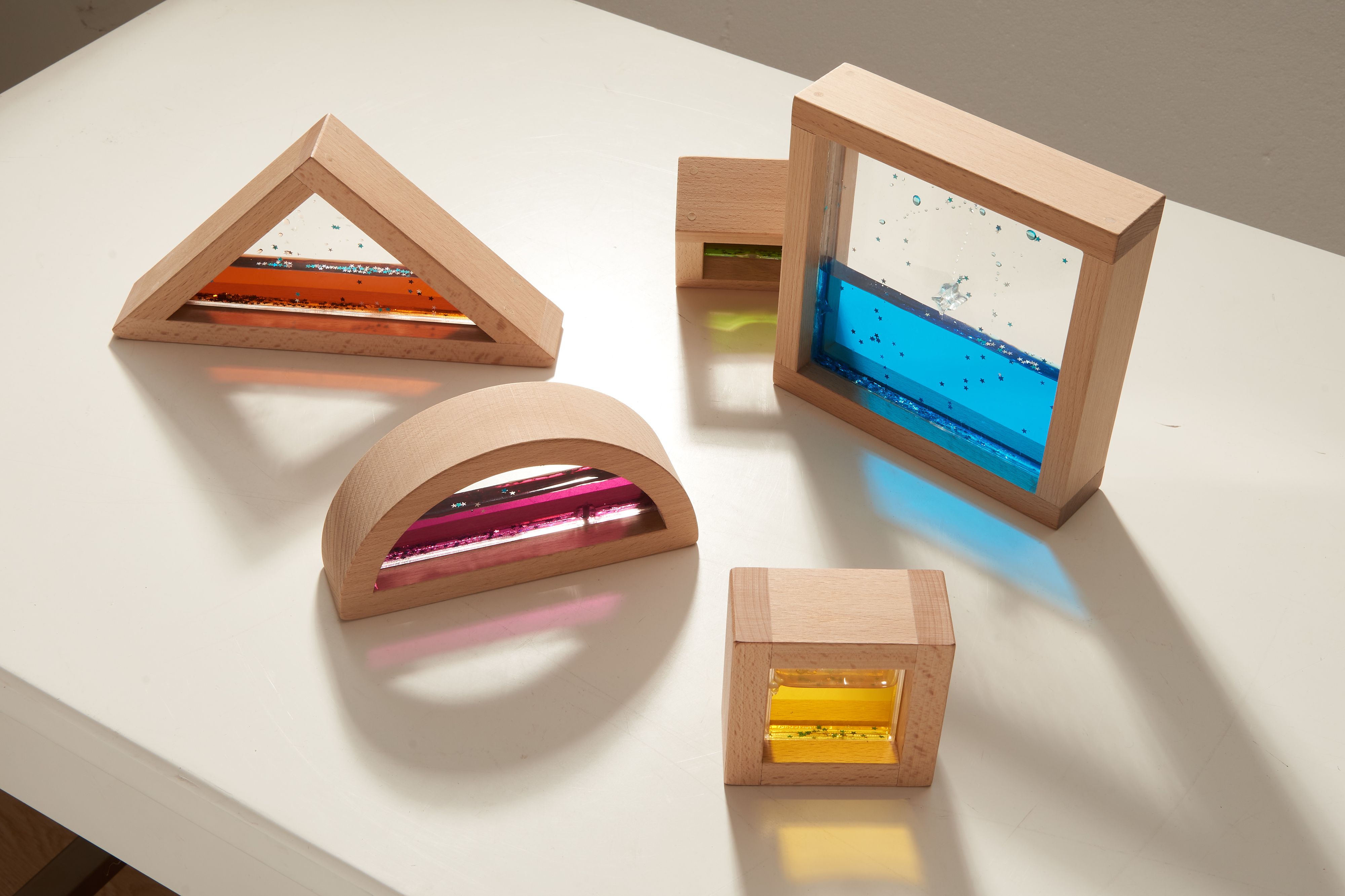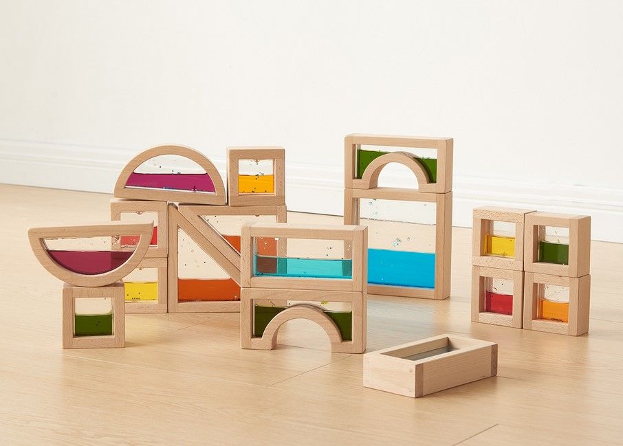 Игровой набор представлен в виде 18 деревянных блоков с акриловыми прозрачными стеклами, заполненными разноцветной жидкостью внутри.