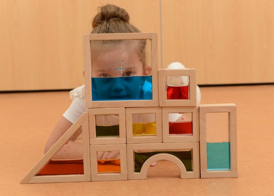 - наблюдать, как окружающий мир меняет цвет, если смотреть на него через цветной блок, а если смотреть сразу через два разноцветных блока, то получится новый цвет;