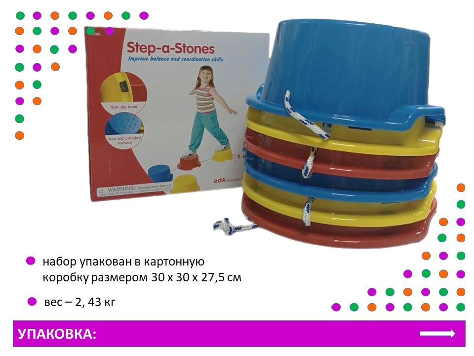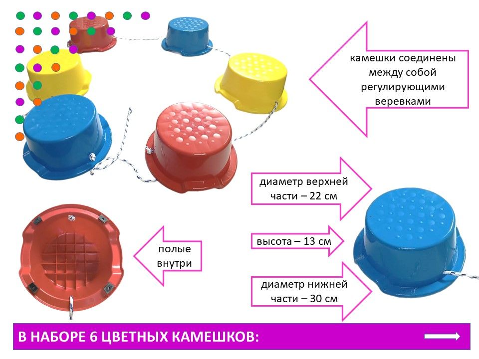 "Дорожка из камешков" – это отличный тренажер для развития моторики, координации и чувства равновесия у детей. Набор состоит из 6 прочных пластиковых "камешков" разных цветов, соединенных регулирующимися веревками. Ребристая поверхность обеспечивает хорошее сцепление, а ручки и резиновые накладки на основании делают использование безопасным. Подходит для игр в помещении и на улице. Размеры одного "камешка": верх - 22 см, низ - 30 см, высота - 13 см.