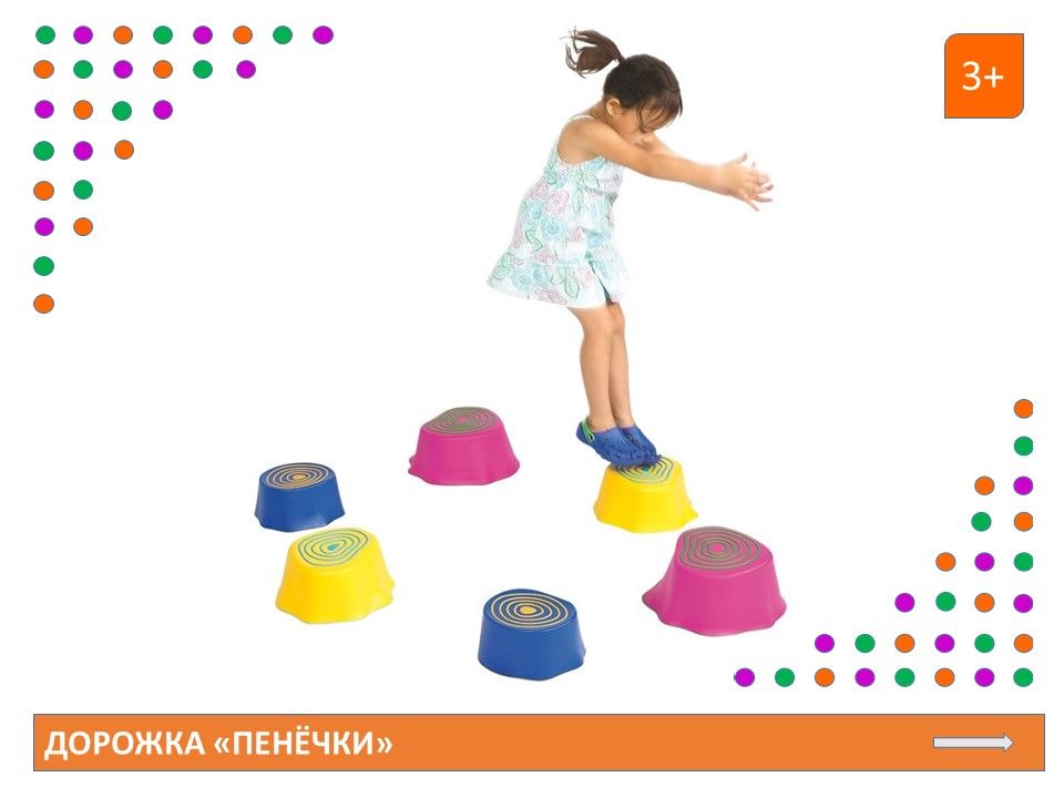 Дорожка «Пенёчки» – отличный инструмент для развития у детей общей моторики, чувства равновесия и координации движений!