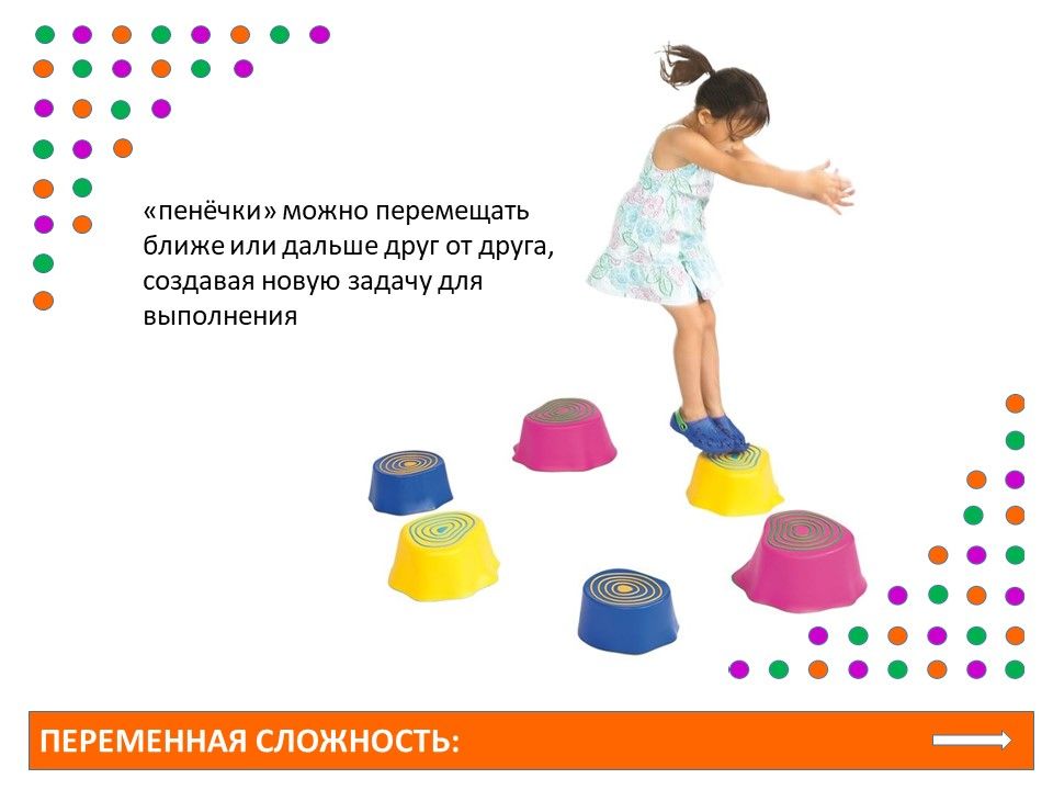 "Пенечки" можно включать в полосу препятствий для спортивных соревнований, а также можно использовать в сюжетно-ролевой игре или придумать свою собственную игру.
