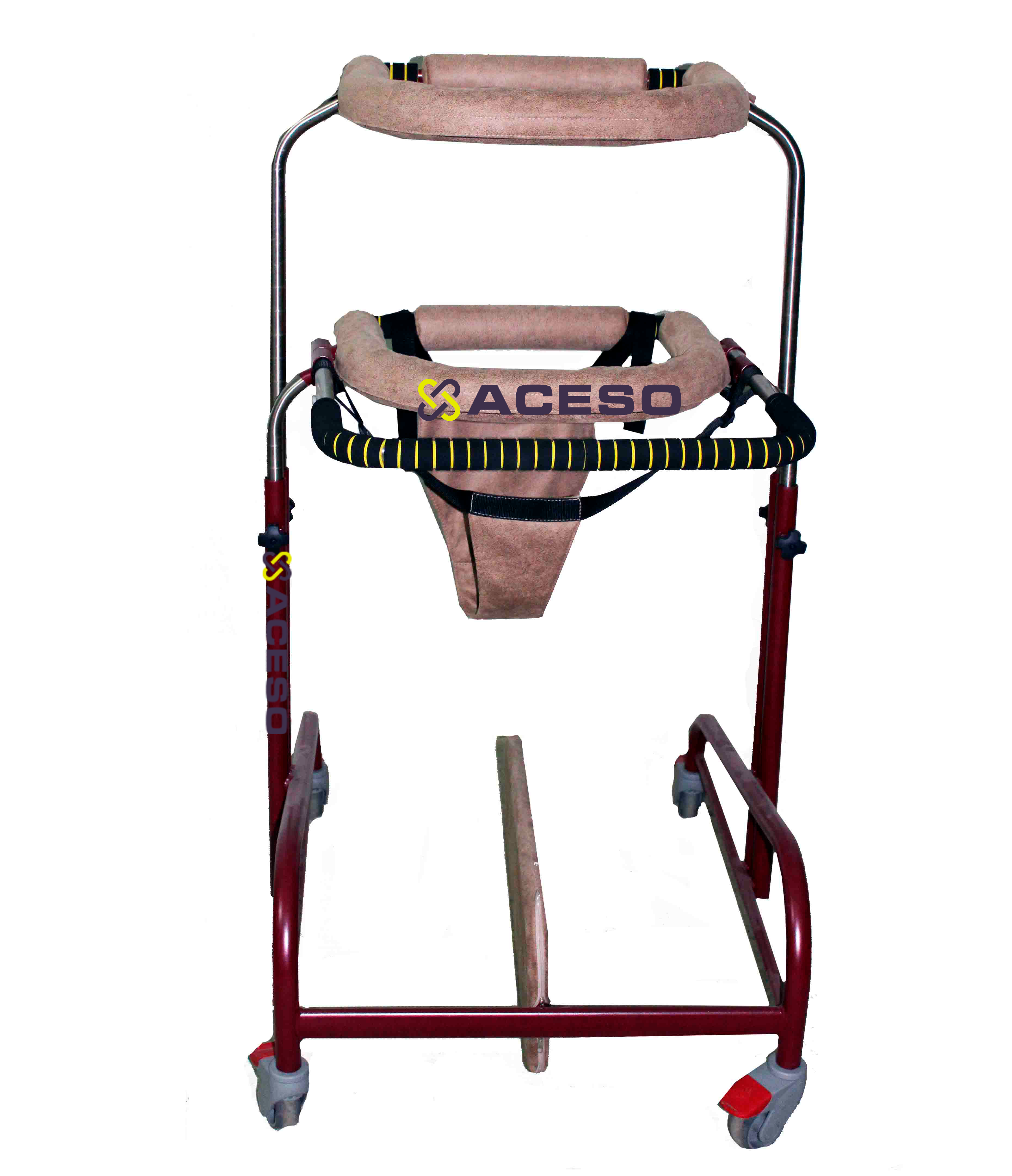 Ходунки с двумя уровнями поддержки - грудной и бедренной обоймами, с большими поворотными колесами, со стояночными тормозами, разделителем для ног и мягкими поддерживающими трусиками.