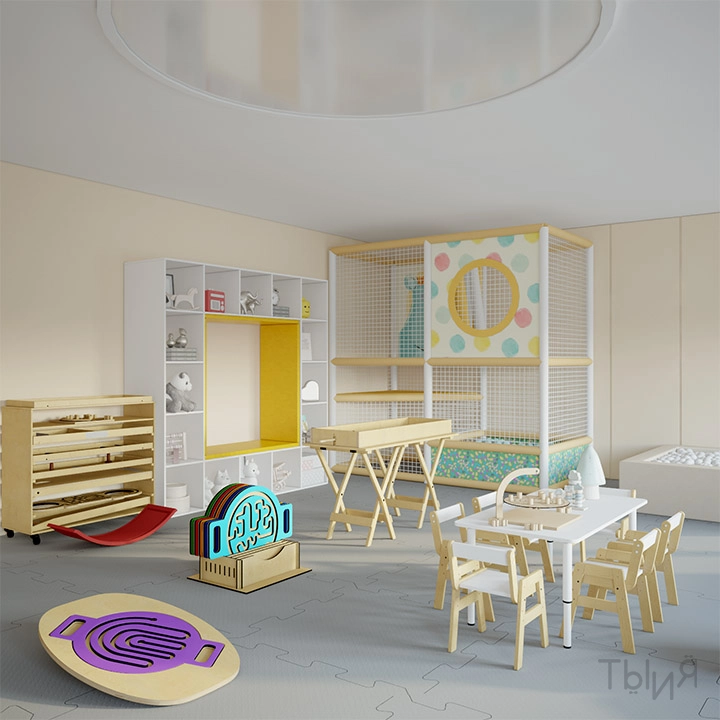 Предназначен для активного и всестороннего развития детей 3–5 лет. Включает модули для лазания, ползания, прыжков и подвижных игр — горки, тоннели, мягкие препятствия, развивающие элементы. Способствует развитию координации, силы, ловкости и социальных навыков.