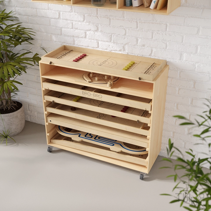 Комплект из 5 командных настольных игр и мобильного стеллажа для хранения. Игры выполнены из фанеры высшего сорта с масляным покрытием — безопасны, приятны на ощупь, удобны в использовании. Развивают координацию, ловкость, командную работу и стратегическое мышление. Подходят для детей и взрослых, интуитивно понятные правила.