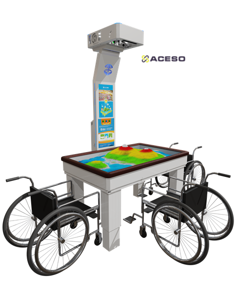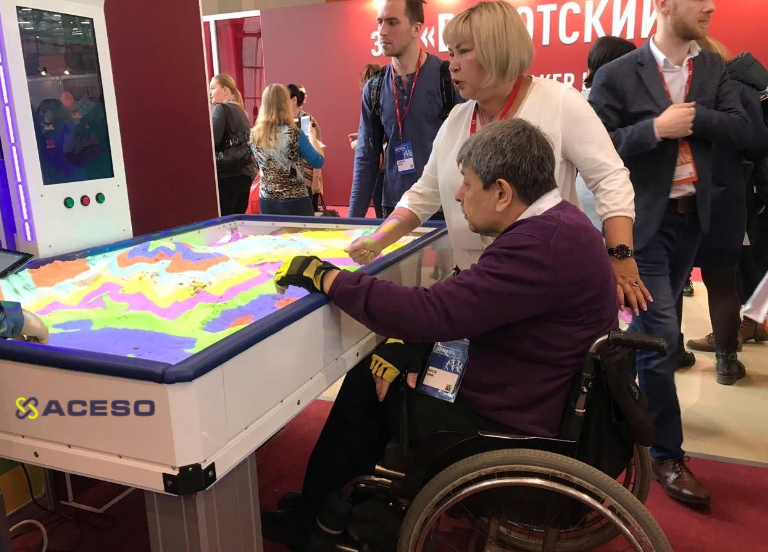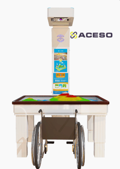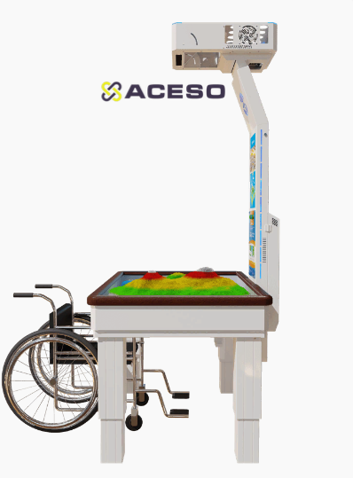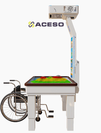 Ее отличительная особенность заключается в том, что она адаптирована для детей и взрослых с нарушениями опорно-двигательного аппарата, ДЦП и нарушениями психоэмоционального развития. Высота игрового поля регулируется при помощи пульта управления на стойке проектора. Песочница снабжена двухуровневой системой защиты при регулировании высоты и мягкими бортиками для дополнительного комфорта и защиты от травм.