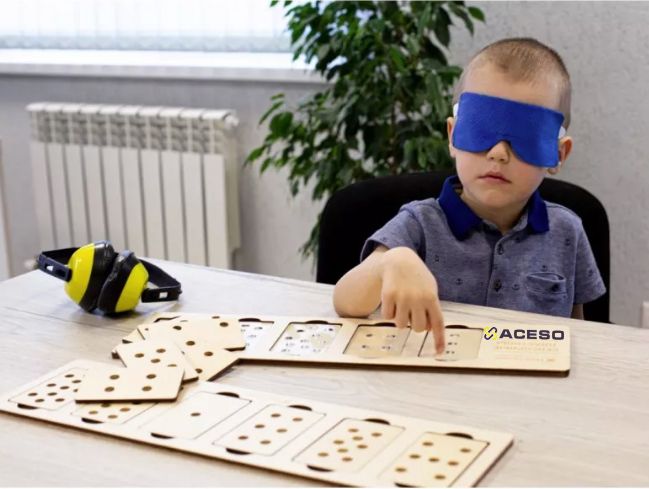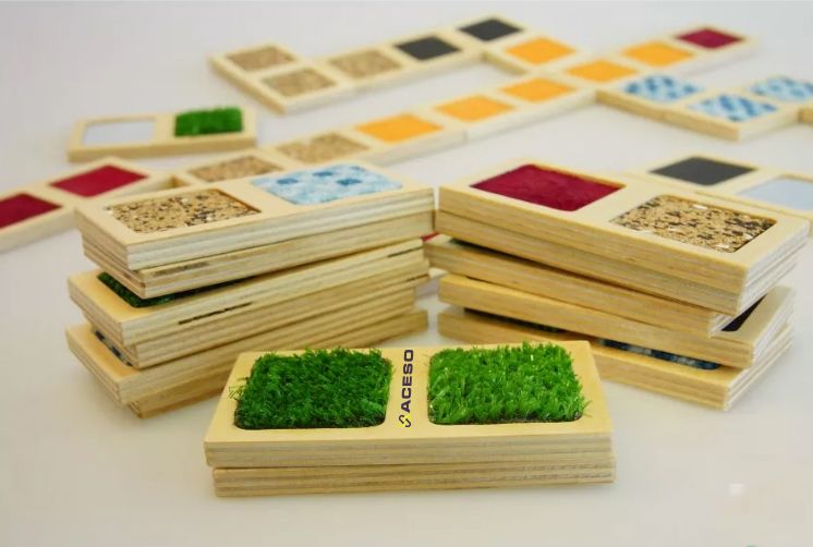 - Набор методических материалов "Тактильное домино" - «Тактильное домино» предназначено для обучающих занятий с детьми дошкольного возраста, помогает ощутить разные фактуры предметов, их цвет, тактильные ощущения. Работа с набором учит детей групповой игре и взаимодействию в коллективе, тренирует зрительную память, развивает тактильное восприятие и пространственное мышление, а также помогает детям анализировать и сравнивать.