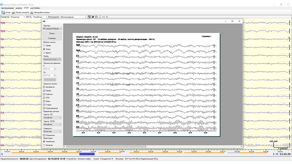 - возможность печати необходимых участков ЭЭГ-сигнала в соответствии с установленными параметрами (временной интервал печати, печать провокационных проб, печать активного экрана с сигналом и всего зарегистрированного ЭЭГ-сигнала);
