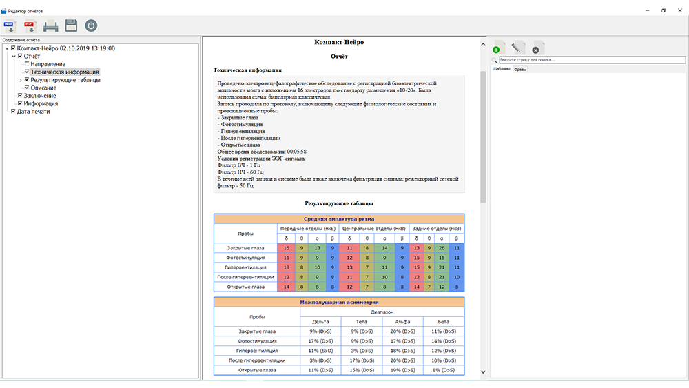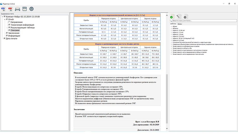 - встроенная база данных типовых шаблонов и фраз для заполнения полей отчетной формы (предустановленные шаблоны для составления заключений), возможность добавления, сохранения, редактирования и удаления собственных шаблонов и фраз.