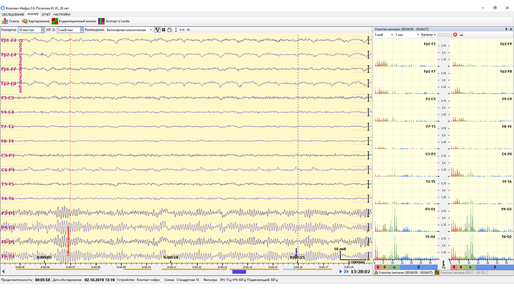 - расчет межполушарной асимметрии, индекса и частоты ритмов.