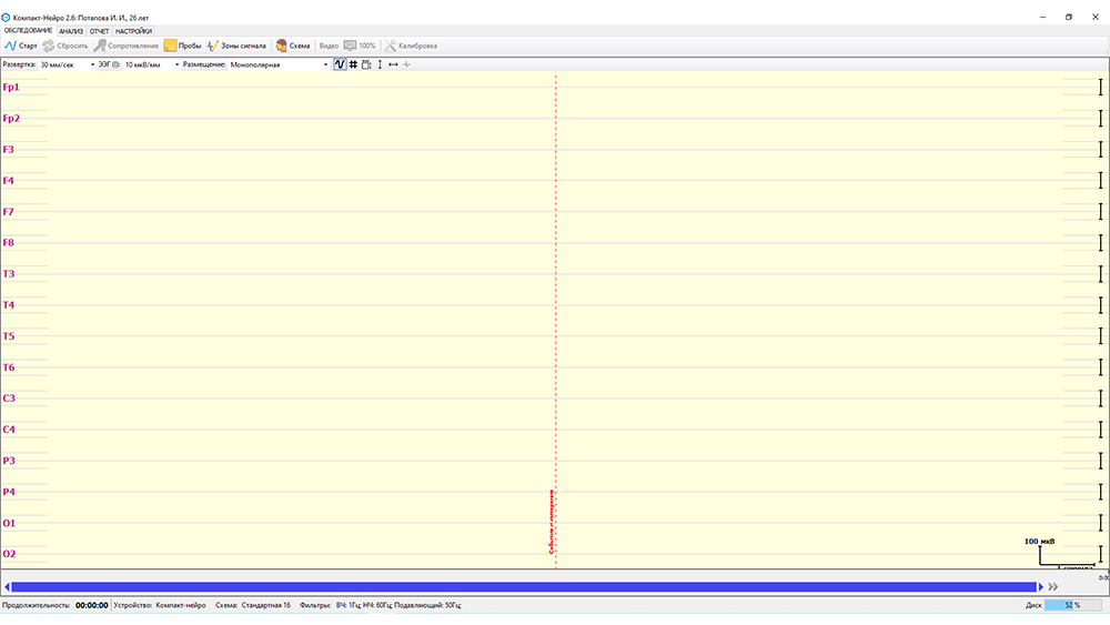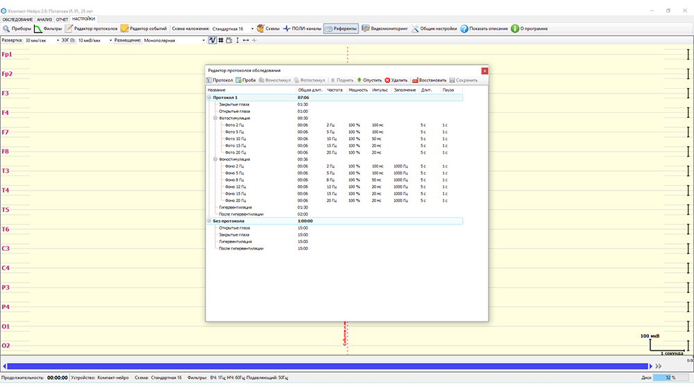 - запись ЭЭГ-сигнала по протоколу и без протокола, возможность менять последовательность проведения провокационных проб в рамках протокола;