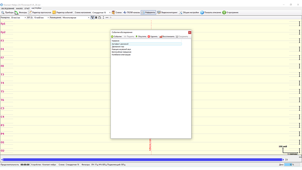 - возможность добавления событий, зон ЭПИ-активности, артефактов, текстовых пометок, проб на регистрируемый сигнал как в режиме регистрации ЭЭГ-сигнала, так и по его завершении;