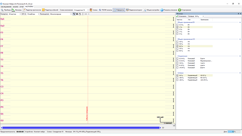 - применение цифровых фильтров как в реальном времени, так и после завершения регистрации сигналов, фильтрация сетевых помех;