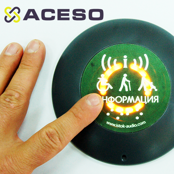 Кнопка с передатчиком сигнала беспроводная антивандальная для маломобильных категорий граждан располагается на стене, недалеко от базового блока. При нажатии на кнопку базовый блок воспроизводит предварительно записанное звуковое сообщение. Кнопка может размещаться как внутри, так и снаружи помещения, температурный диапазон позволяет использовать ее в регионах с самыми разными климатическими условиями. Надписи на лицевой стороне кнопки выполнены выпуклым шрифтом и дублируются шрифтом Брайля. Корпус устройства выполнен из антивандального пластика, а специальная форма позволит уберечь кнопку от кражи. Благодаря большой зоне нажатия и подтверждению вызова звуковым и световым сигналом пользоваться устройством могут все категории людей с ограниченными возможностями.