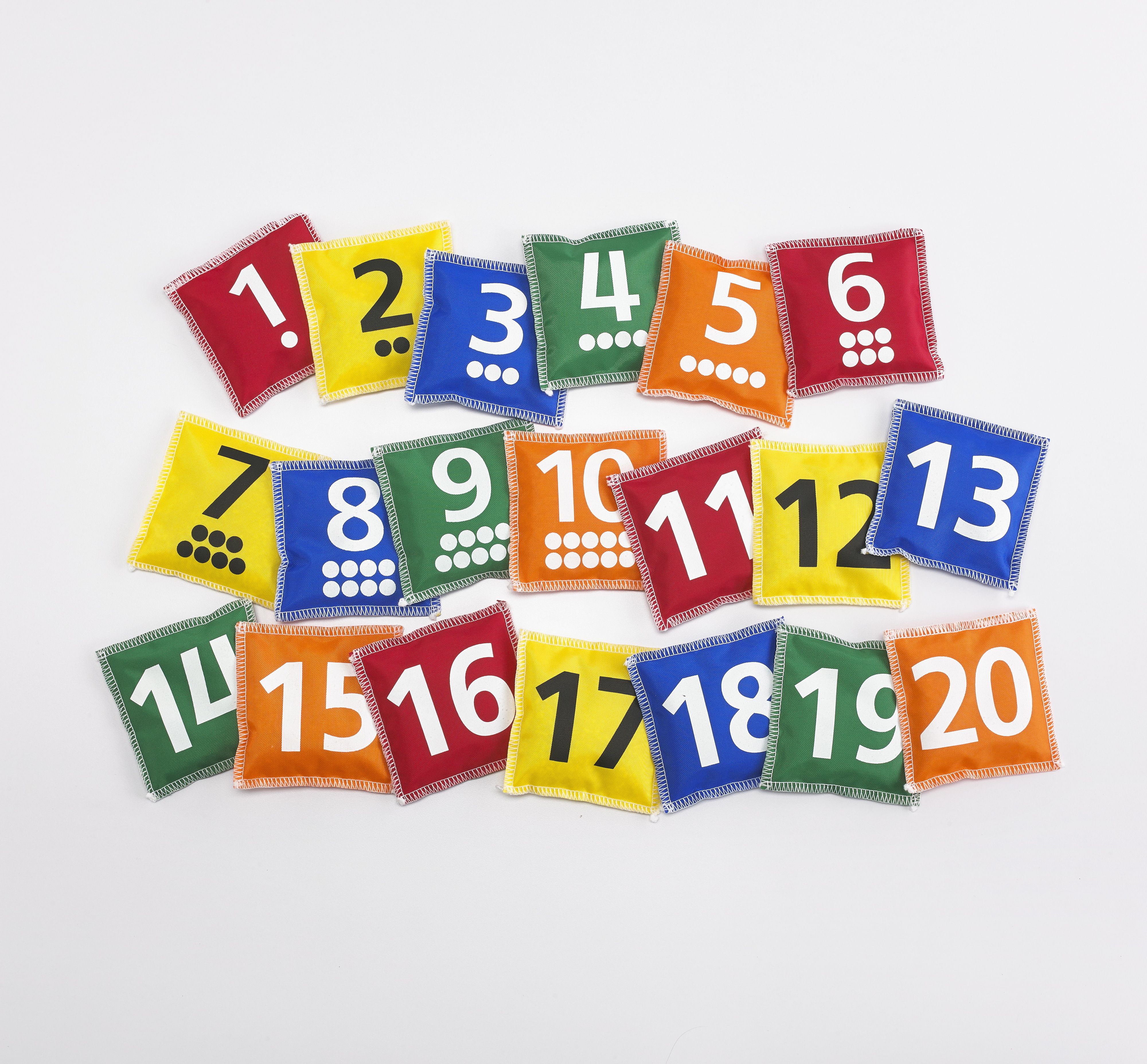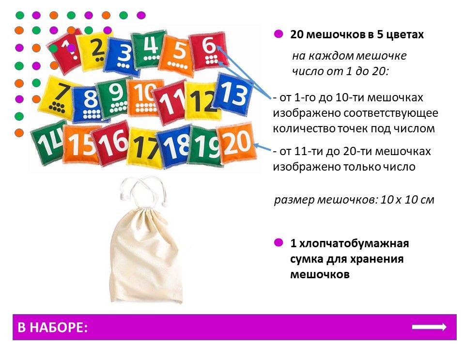 В наборе мешочки с числами от 1 до 20 (с сыпучим материалом внутри) в 5 цветах и сумка для хранения.