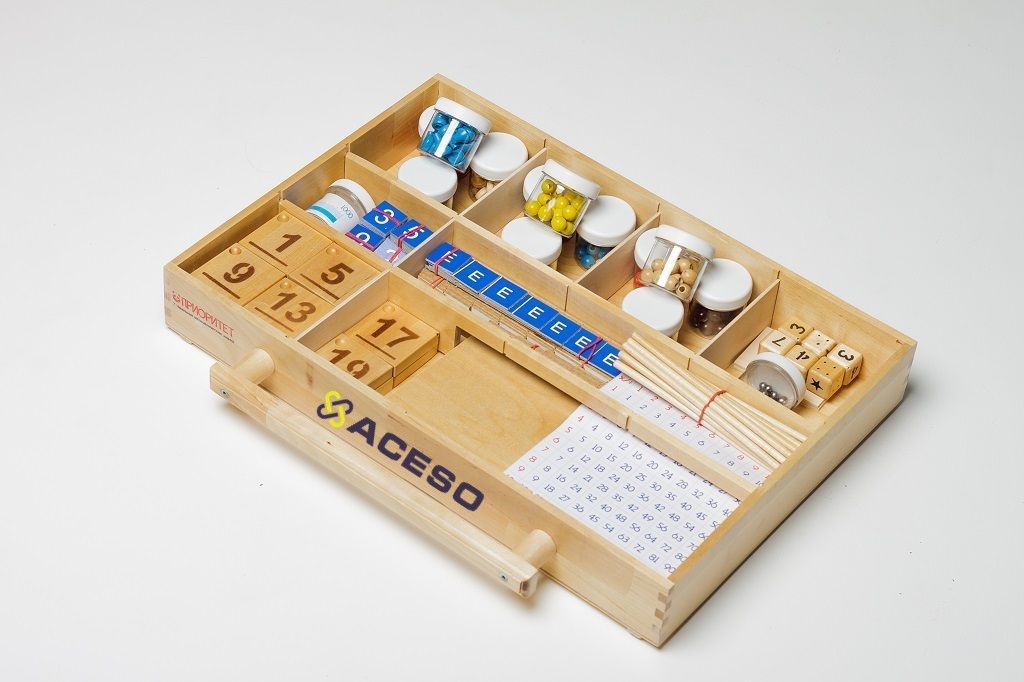 - 270 деталей: большие и маленькие кубики с цифрами, карточки с цифрами, ленты с обозначением миллиметров и сантиметров, счетные элементы разных цветов.