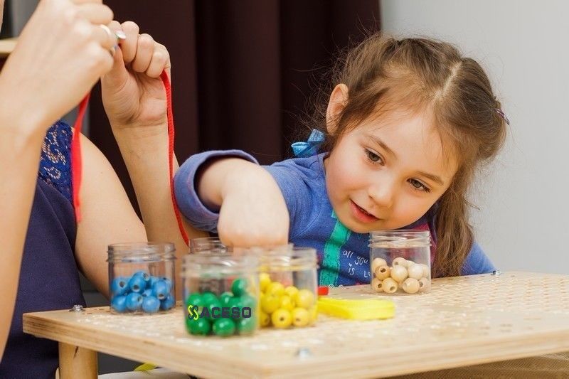 Дети очень любят игры с этим комплектом: они могут собирать украшения с бусинами одного цвета или чередованием оттенков, учатся отыскивать идентичные предметы. Детали отличаются не только цветом и размером, но и формой.