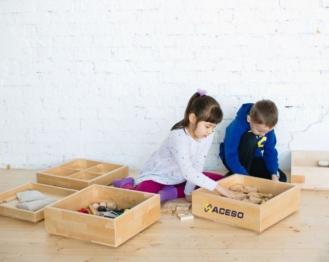 Комплект для классификации предметов. Ящик имеет разделители, которые определяют четыре зоны. В них необходимо складывать фигурки, следуя примеру педагога.