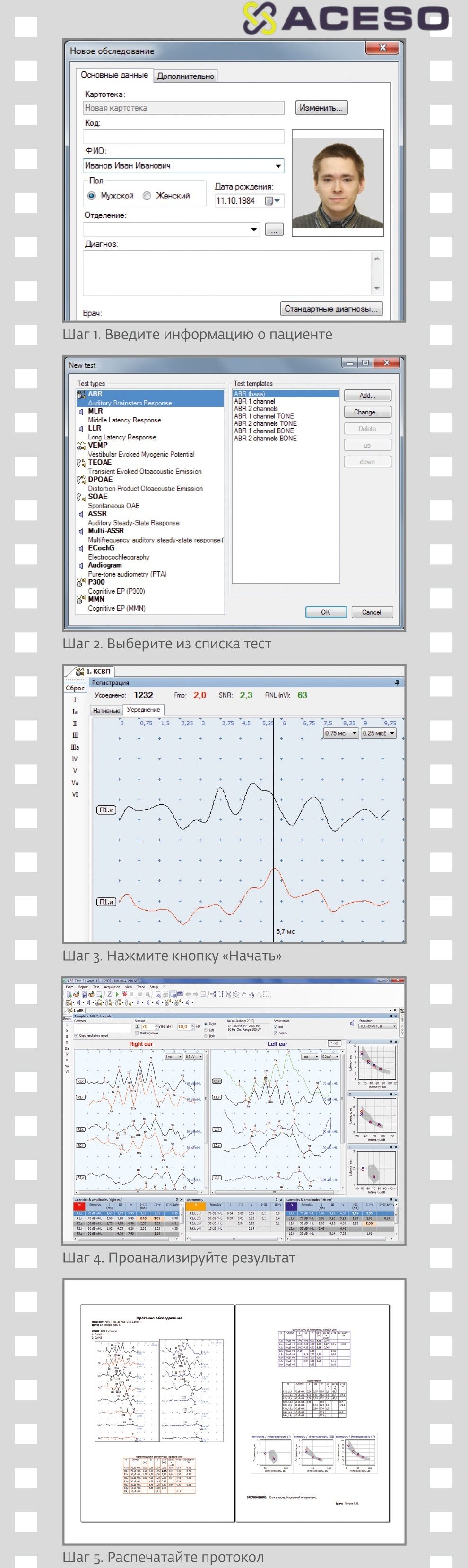 Продуманные характеристики прибора (низкий уровень шумов усилителя) и программы (адаптивный сетевой фильтр, взвешенное усреднение, Chirp-стимул, расчет статистических параметров сигнала и шума, современные алгоритмы автоматического обнаружения ответа) помогают врачу быстро получить качественную запись, экономя временные ресурсы. Все тесты можно проводить на пациенте, находящемся в состоянии бодрствования.
