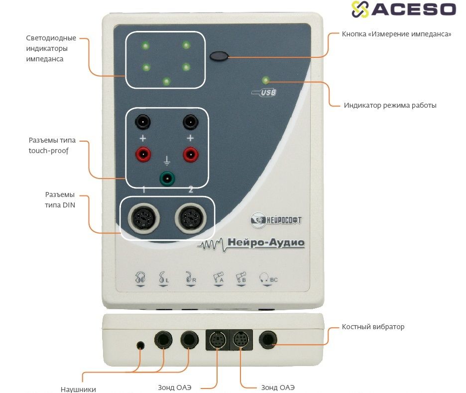 Полный набор объективных и субъективных методик для диагностики уровня поражения слухового и вестибулярного анализаторов, определения порогов слуха: КСВП, ССП/ASSR, мульти-ASSR, ССВП и ДСВП, ЗВОАЭ, ПИОАЭ, СОАЭ, ЭКохГ, ВМВП/VEMP, P300, MMN, тональная аудиометрия — всё в небольшом корпусе.