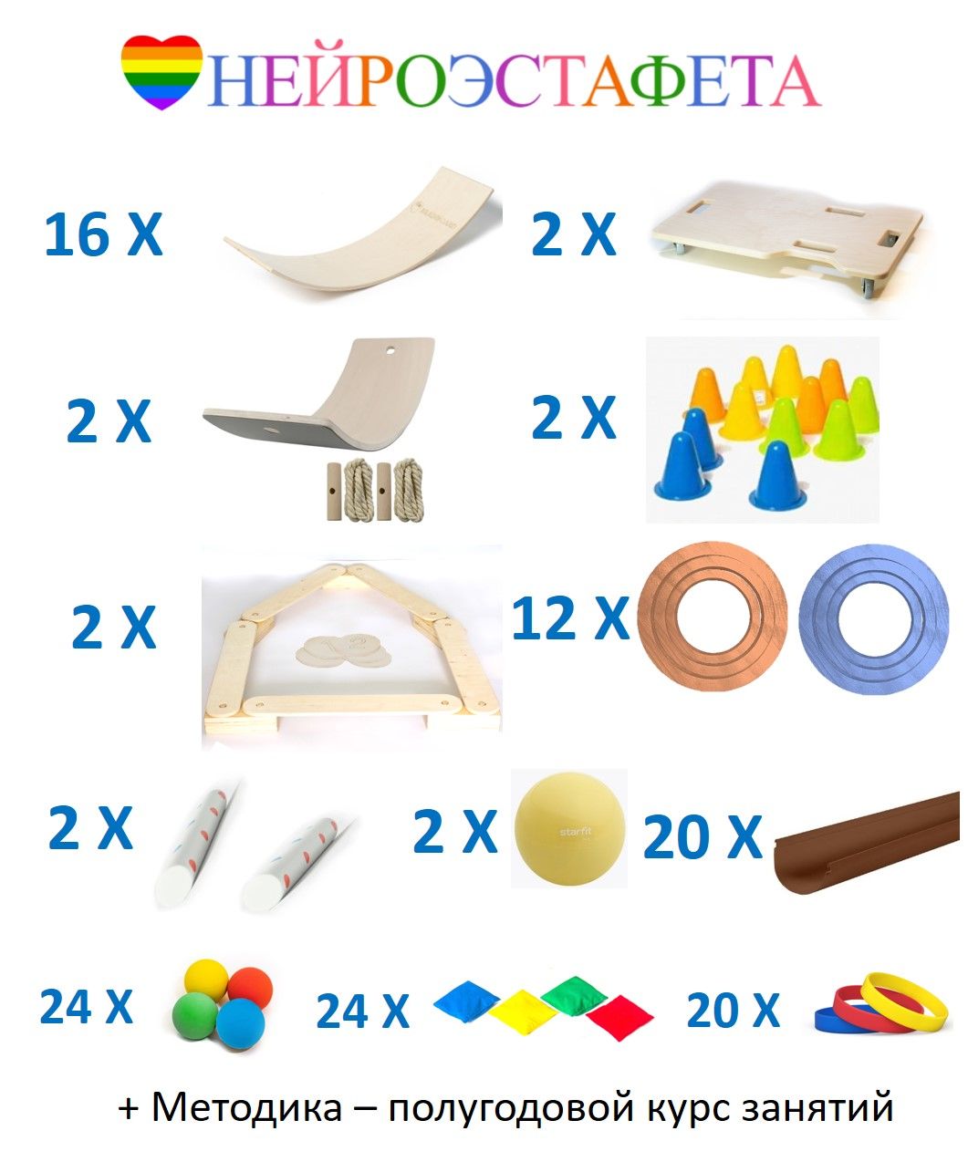 Нейроэстафета - это комплекс нейротренажеров и образовательная программа для детских садов. Рассчитана на специалистов, кто работает с детьми в зале (зарядка, физ. подготовка) специалист ЛФК, психолог, нейропсихилог, логопед. В течение учебного года дети выполняют упражнения, на основе элементов которых формируются задания для эстафеты, рассчитанной на 2-3 команды детей.