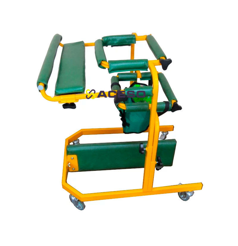 Опора установлена на колесах, задняя пара колес имеет тормоза. Опора регулируется по ширине, длине и высоте, что облегчает обслуживание и не требует дополнительного персонала для регулирования. Предусмотрена регулировка ширины мягких подлокотников на уровне торса. На грудном уровне предусмотрен поручень для удержания равновесия при гиперкинезах. Задняя спинка (спиноупор) открывается, что позволяет, не поднимая ребенка, помещать и фиксировать его в опоре. Опора может быть снабжена столиком и перекладиной между ног. Рекомендуется применять до того, как ребенок сам сможет устойчиво держаться и управлять облегченными ходунками.
