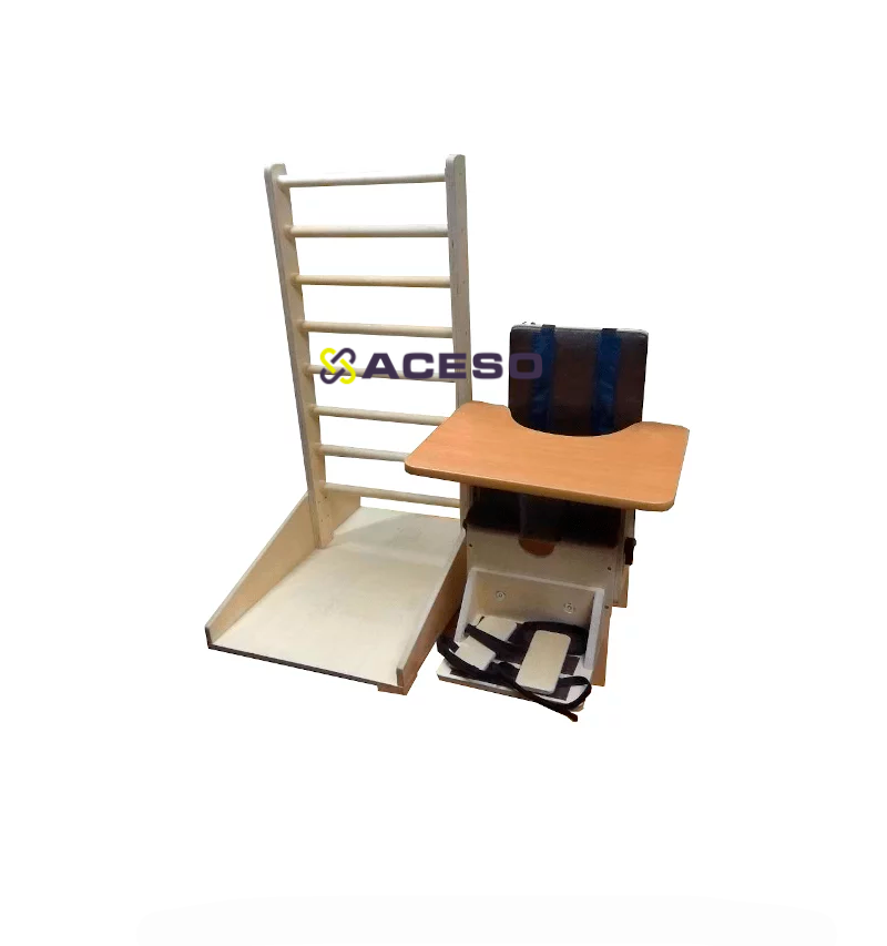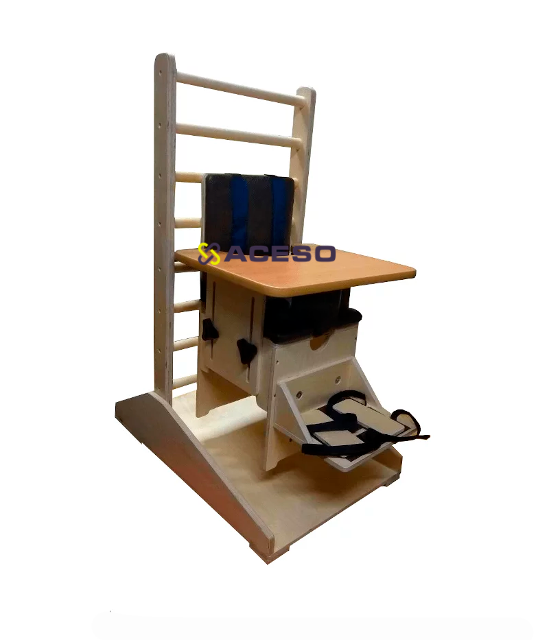 Грудная часть тела фиксируется креплением «уздечка», а тазобедренная - набедренным креплением. При гиперкинезе у ребенка устанавливаются дополнительные приспособления на столешнице, например вертикальные или горизонтальные ручки, прорези для фиксации одной руки, а также дополнительные петли к подножке для более жесткой фиксации голеностопных суставов.