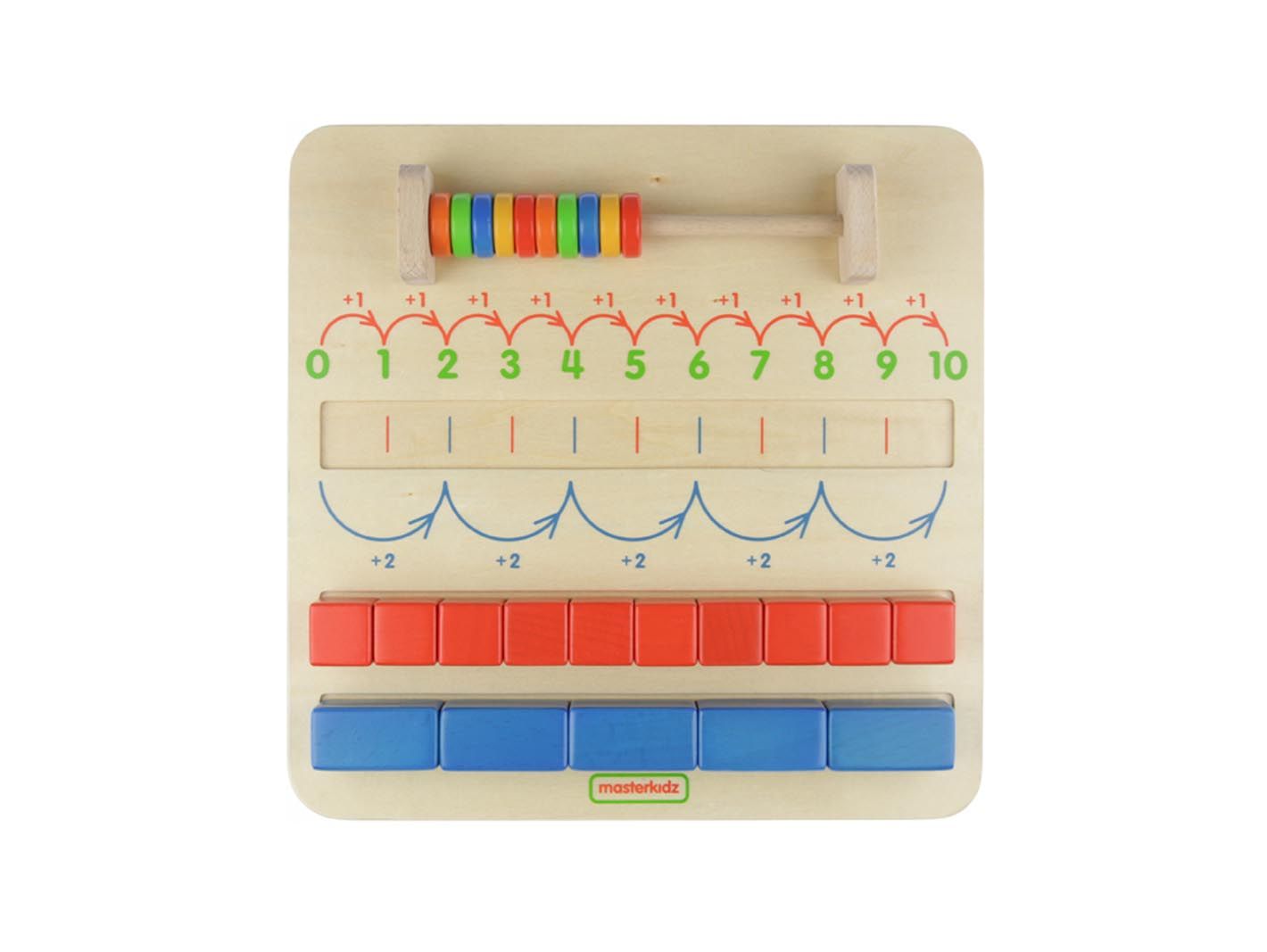 Чтобы показать нечетные числа, необходимо поместить красный блок в дорожку-выемку так, чтобы на нем было написано «1». Затем начните последовательно размещать синие блоки. Каждый раз, когда ставится блок, ребенок будет произносить соответствующее число. В этом случае ребенок будет произносить «1», «3», «5», «7» и «9». Тот же процесс для четной нумерации, начинающейся с «0».