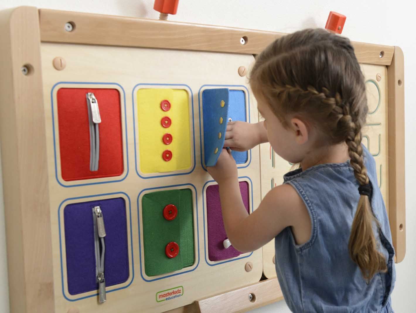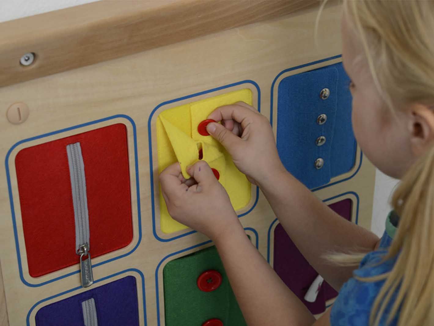 Панель "Ловкость рук 2" предназначена для отработки навыка открывания и закрывания разных типов застежек. Дети могут практиковать ловкость рук, мелкую моторику и зрительно-моторную координацию.