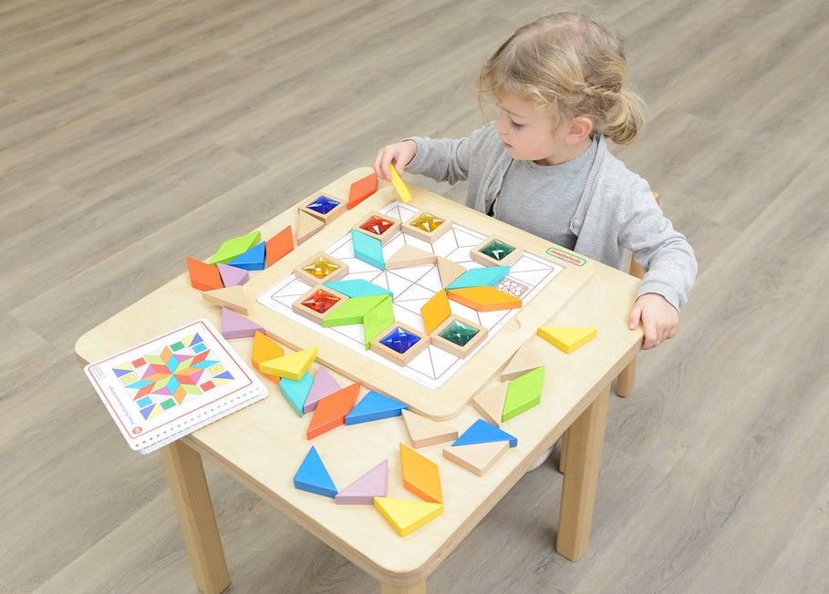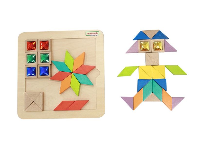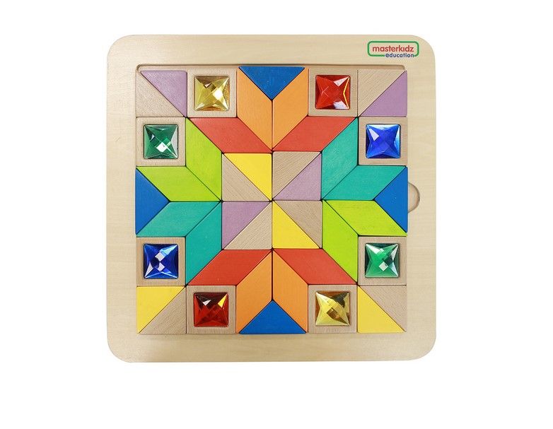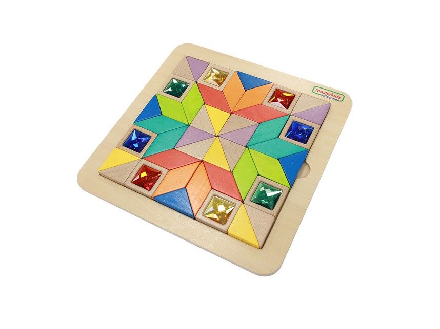 Пособие представляет из себя панель, выполненную из березовой фанеры, на лицевой части которой расположена цветная мозаика. По всей площади панели имеется углубление, в котором расположены деревянные разноцветные плитки в трех геометрических формах (треугольник, квадрат, ромб). Плитки в форме квадрата инкрустированы красочными акриловыми "драгоценными" камнями.