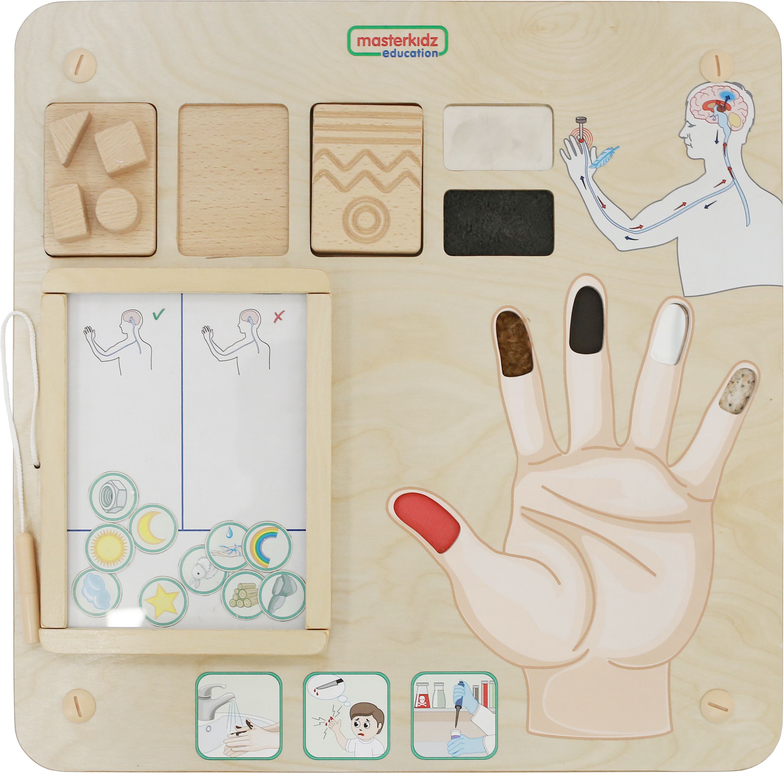 На лицевой части панели с правой стороны изображена кисть руки, на кончиках пальцев которой нанесены различные образцы материалов. Прикасаясь к ним, ребенок понимает, что наша кожа является органом осязания, который мы используем для определения шероховатости, гладкости, твердости, мягкости или различных форм объектов.
