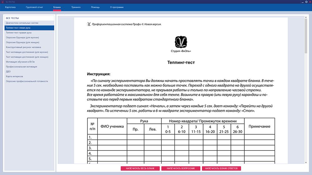 Тесты могут быть проведены как на компьютере, так и в бланковой форме. В программе возможно распечатать как сами бланки, так и вопросник. Результаты обследований с бланков вносятся вручную согласно инструкции по каждому тесту.