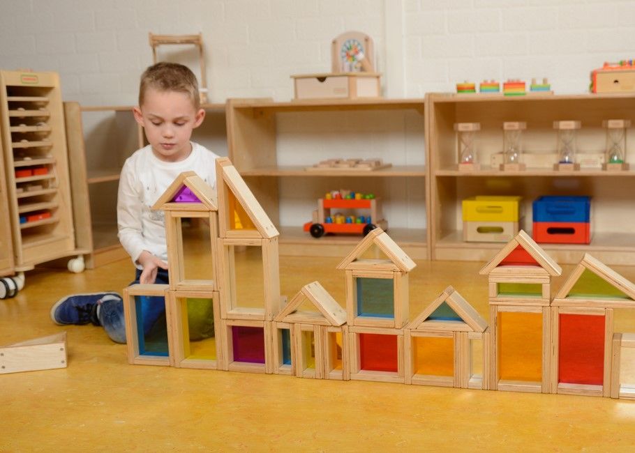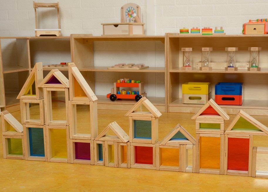 Игровой набор из 51 деревянных блоков различной геометрической формы и размеров с акриловыми зеркальными и прозрачными разноцветными вставками.