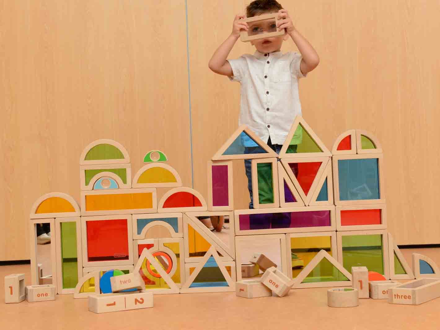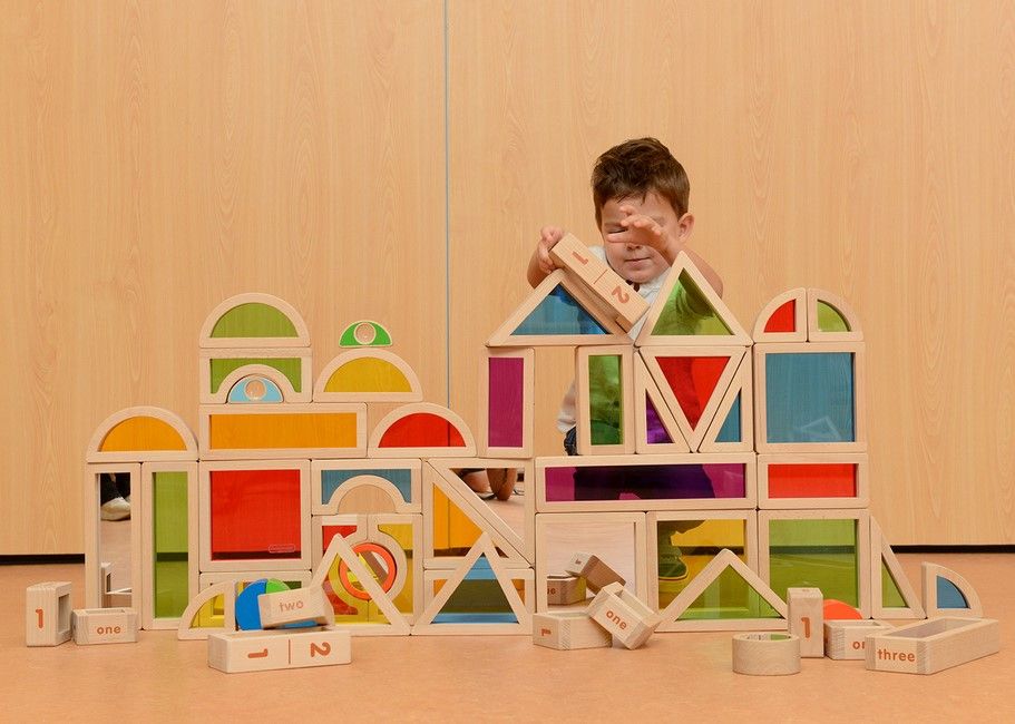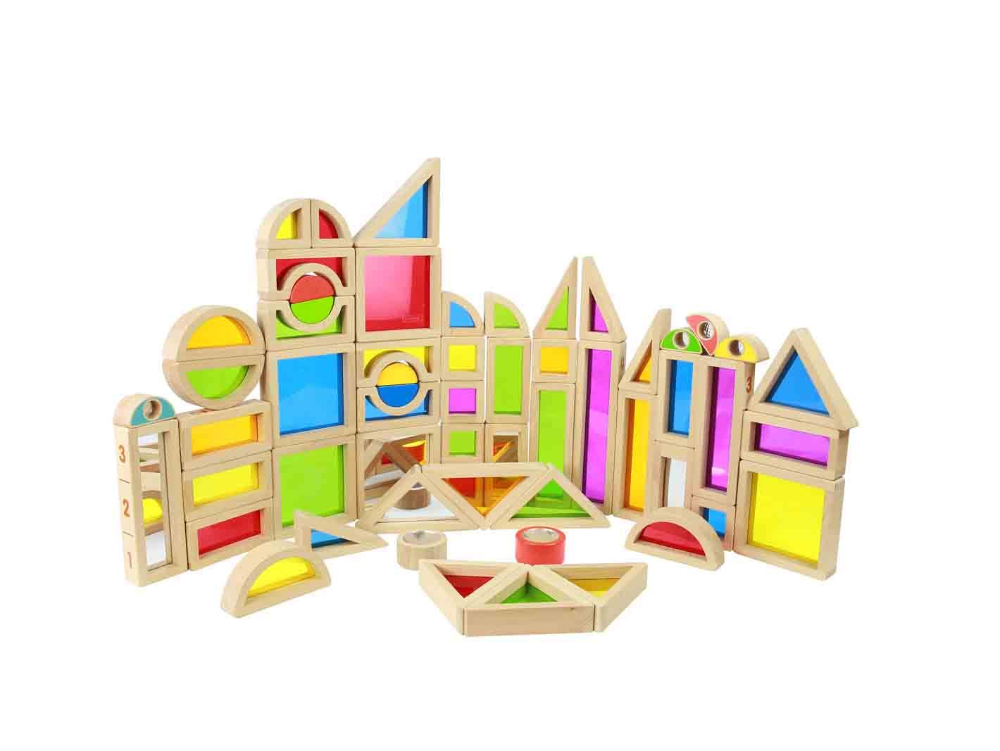Игровой набор из 58 деревянных блоков различной геометрической формы и размеров с акриловыми зеркальными и прозрачными разноцветными вставками. Часть блоков имеет маркировку цифрами (что расширяет спектр решаемых задач).