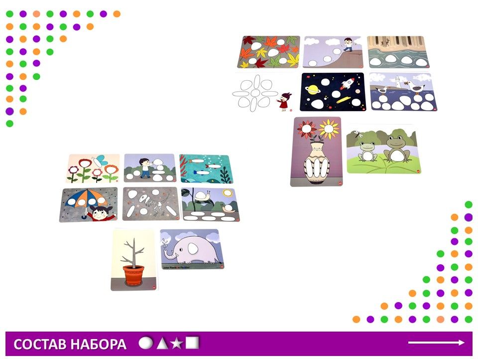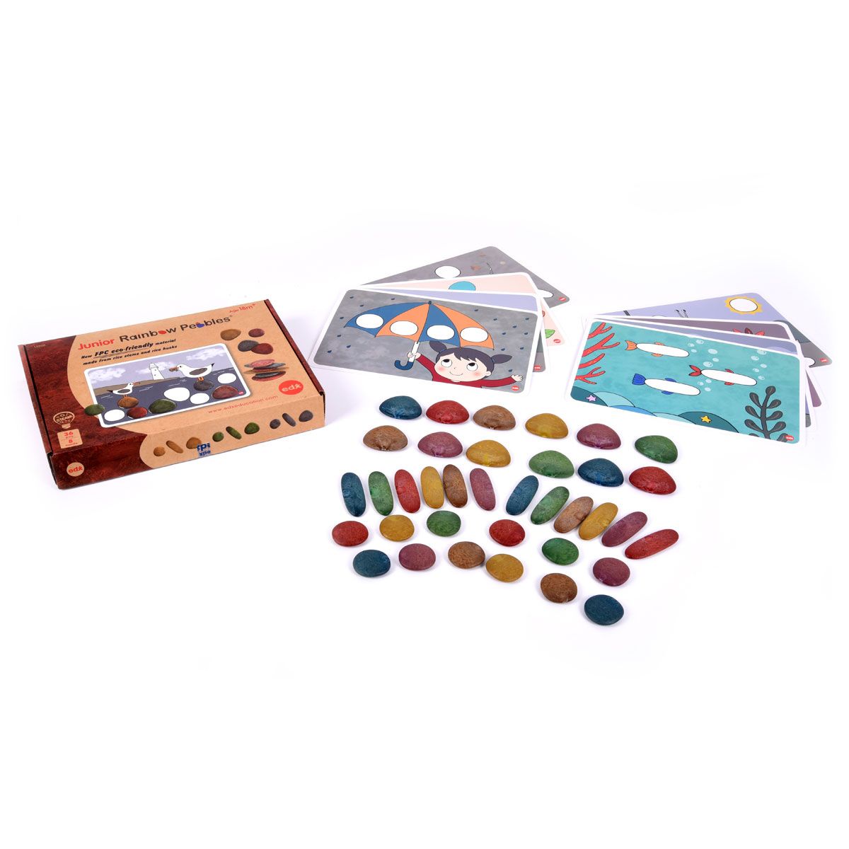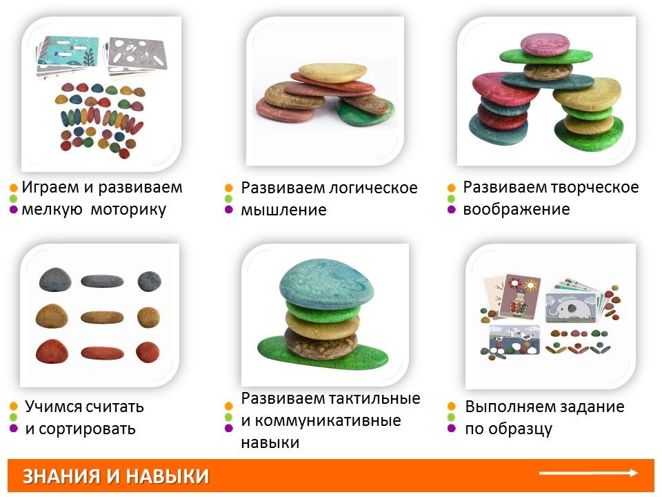 Этот набор изготовлен из натурального материала FPC. Двухсторонние карточки разработаны в естественных цветовых тонах, чтобы соответствовать камешкам. Набор включает в себя камешки в 3 формах, 6 цветах, 36шт и 8 двухсторонних карточек с заданиями.