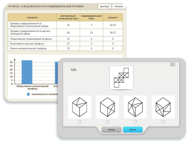 Субтесты на общую осведомленность включают в себя понятия научно-культурного и общественно-политического характера, а субтесты Аналогии, Классификации, Обобщения – основные понятия из школьного курса физики, математики, литературы, русского языка, истории, географии и биологии. Задания на пространственное мышление построены на материале геометрии и черчения.