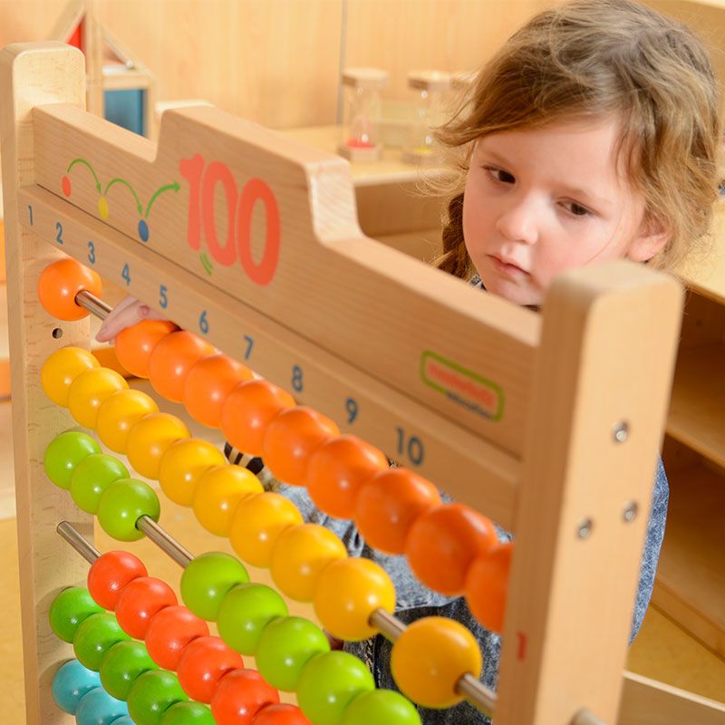 Эти гигантские напольные счёты изготовлены из прочного европейского бука и сверхпрочных стержней из нержавеющей стали. Состоят из 10 рядов разноцветных шаров на горизонтальных металлических направляющих, которые вмонтированы в 2 вертикальных деревянных бруска. Общее количество шаров 100 шт, в 10-ти цветах.. В верхней части счётов по горизонтали и сбоку по вертикали изображен числовой ряд от 1 до 10, в нижней части – числовой ряд от 10 до 1.