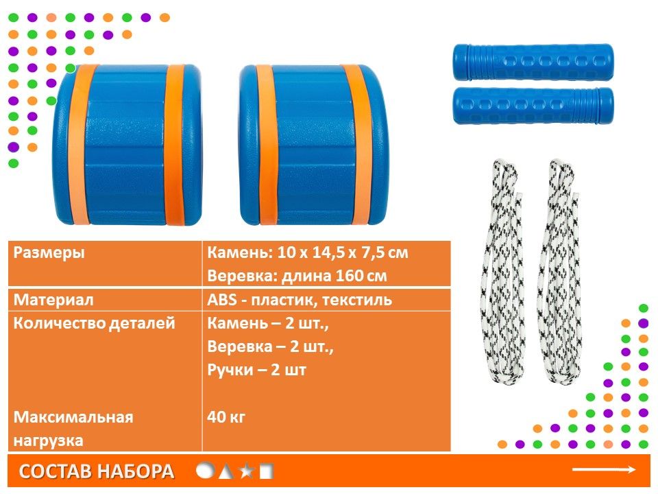 Шагающие камни – это отличный спортивный инвентарь для активных игр и развития детей. Представляют собой половинки цилиндров с нескользящей поверхностью и веревочным креплением. Ребенок встает на камни и, удерживая их веревками, делает шаги, развивая координацию, ловкость, гибкость и укрепляя мышцы. Синие шагающие камни - отличный выбор для детского сада или школы. В комплекте 2 камня, размер каждого 10 х 14,5 х 7,5 см. Ручки с регулировкой длины веревки.
