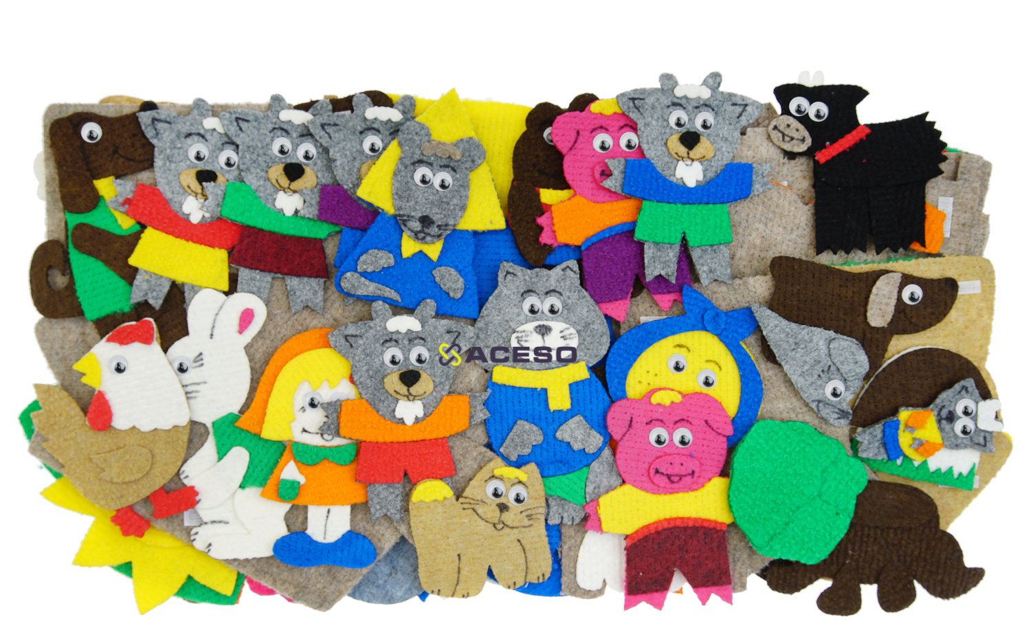 Персонажи: дед, бабка, внучка,жучка, кошка, мышка мал., колобок, кот, курочка Ряба, журавль, мышка-норушка, лягушка, ежик, петушок, зайка белый, зайка серый, волк, лиса, медведь, соломенный бычок, собака 2шт., охотник 2 шт., матушка, медведица, медвежонок, коза, козлята 7шт., поросята 3 шт. Декорации:солнышко, тучка, облако, дерево, елка, пень, гриб, костер, домики для поросят 3шт., ледяная избушка, теремок, миски 3шт., ложки 3шт., стул 3шт., кроватка 3шт.