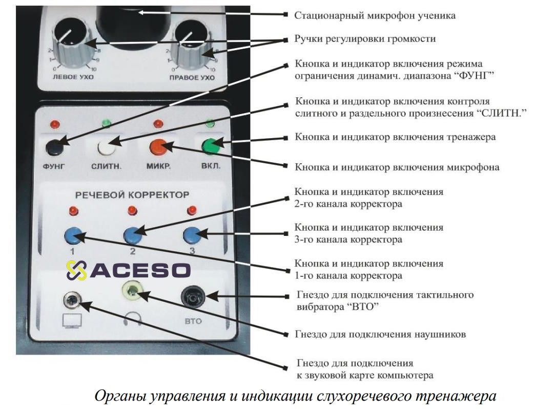 Для этих целей в приборе предусмотрены специализированный усилитель мощности, наушники, стационарный микрофон для ученика, проводной микрофон для преподавателя, речевой спектральный корректор, индикатор, позволяющий работать над ритмом и слитностью произносимых слов и фраз и гнезда для подключения вибратора и внешних источников речевой информации.