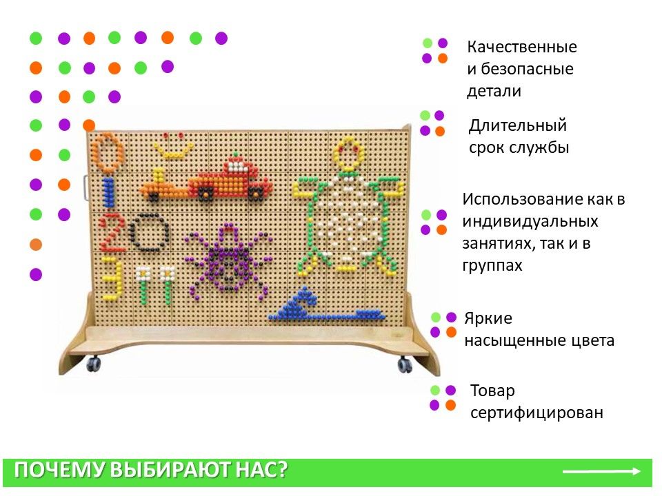 Внимание: колышки, сокровища, шнуровки, винты, кинетические треки, развивающие панели и другие комплекты для STEM-стены приобретаются отдельно.