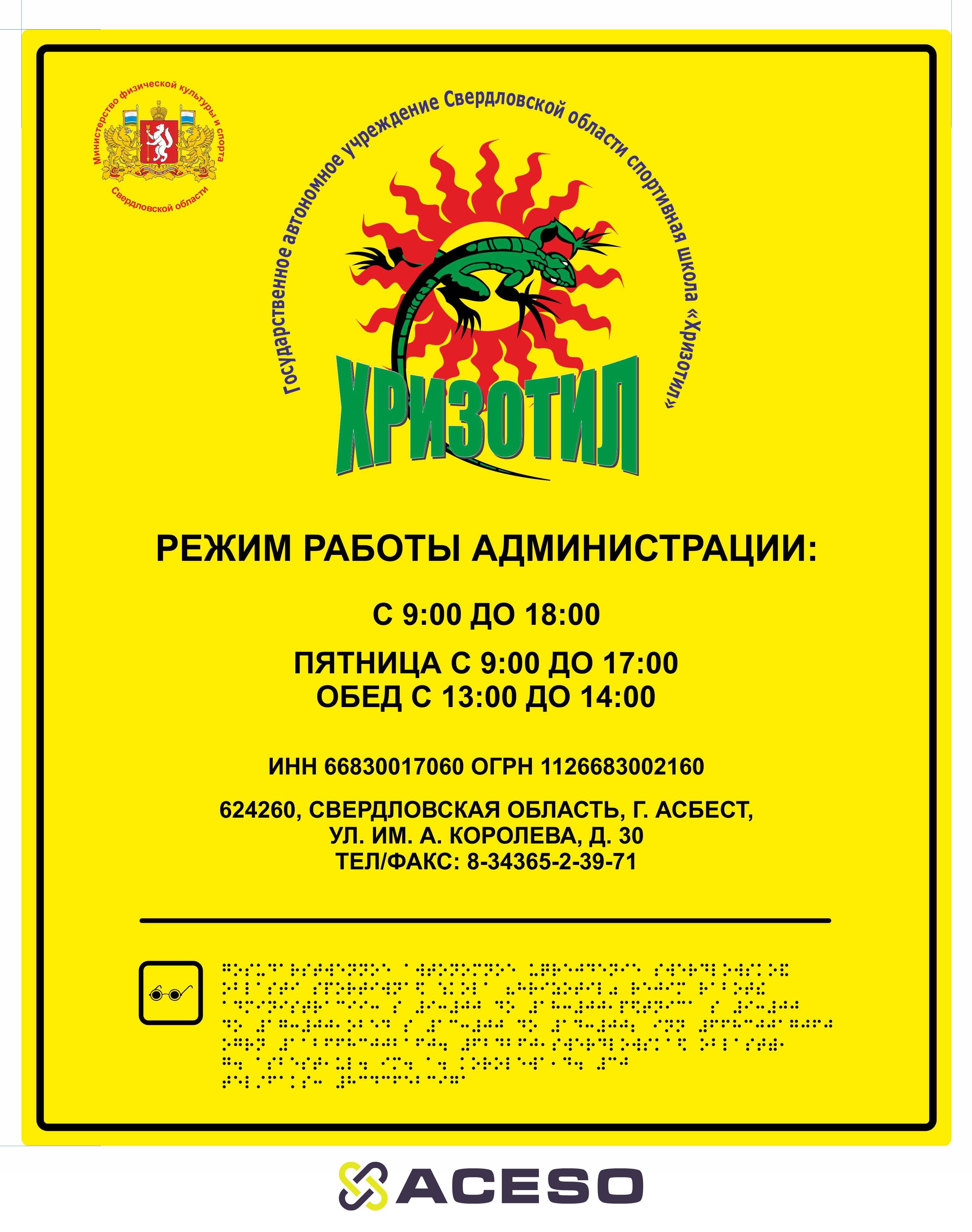 Эта тактильная табличка с режимом работы изготовлена из прочного пластика ПВХ толщиной 3 мм. Она имеет размеры 500х600 мм, что обеспечивает достаточно большую площадь для размещения информации. На табличке созданы тактильные знаки, которые позволяют людям ощущать информацию прикосновением пальцев. Кроме того, текстовая информация на табличке дублируется шрифтом Брайля, что позволяет людям со слабым зрением читать и понимать ее.