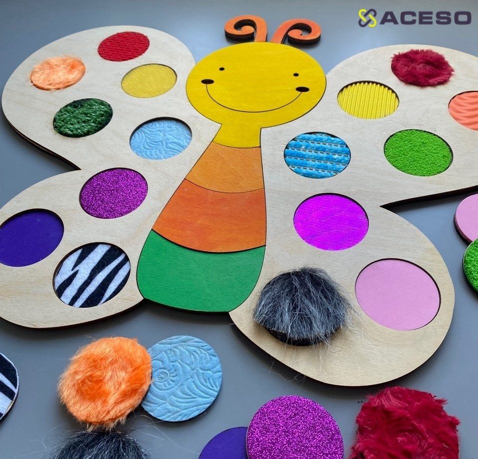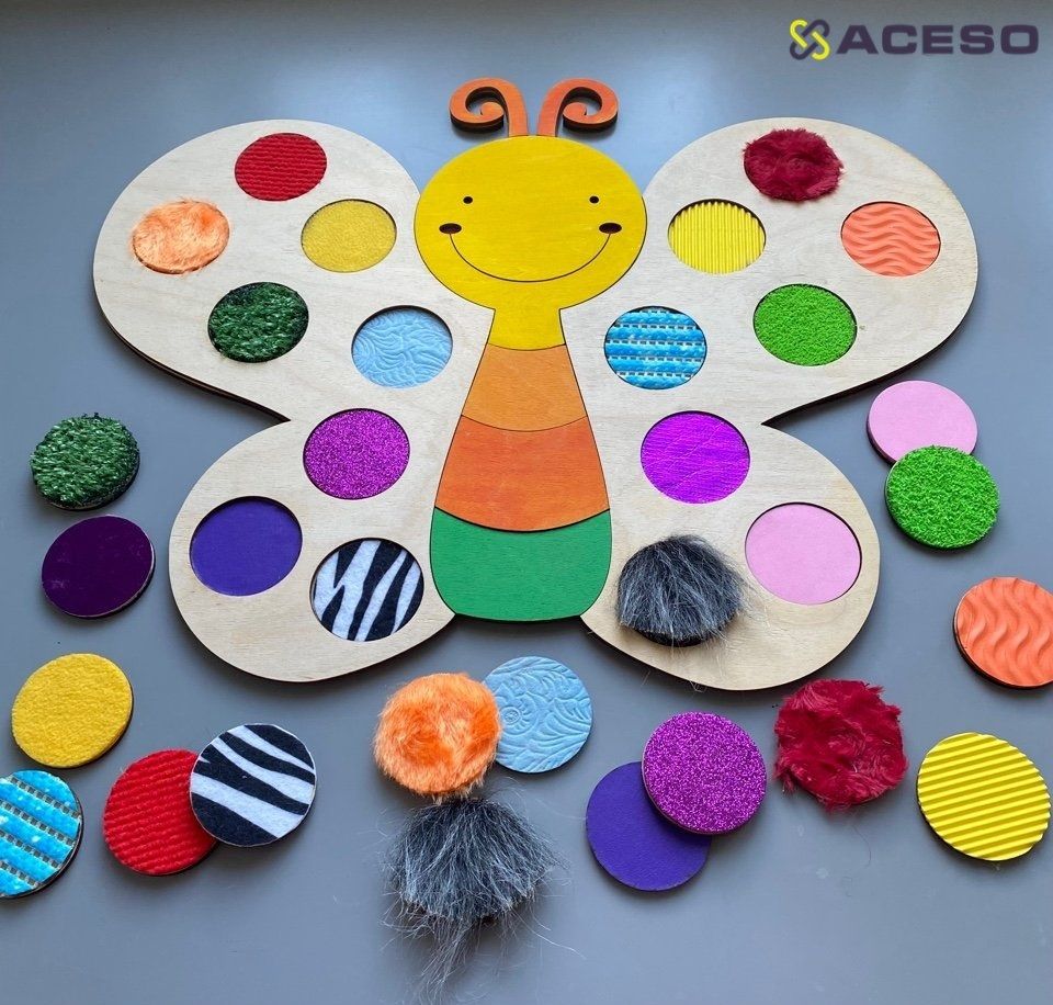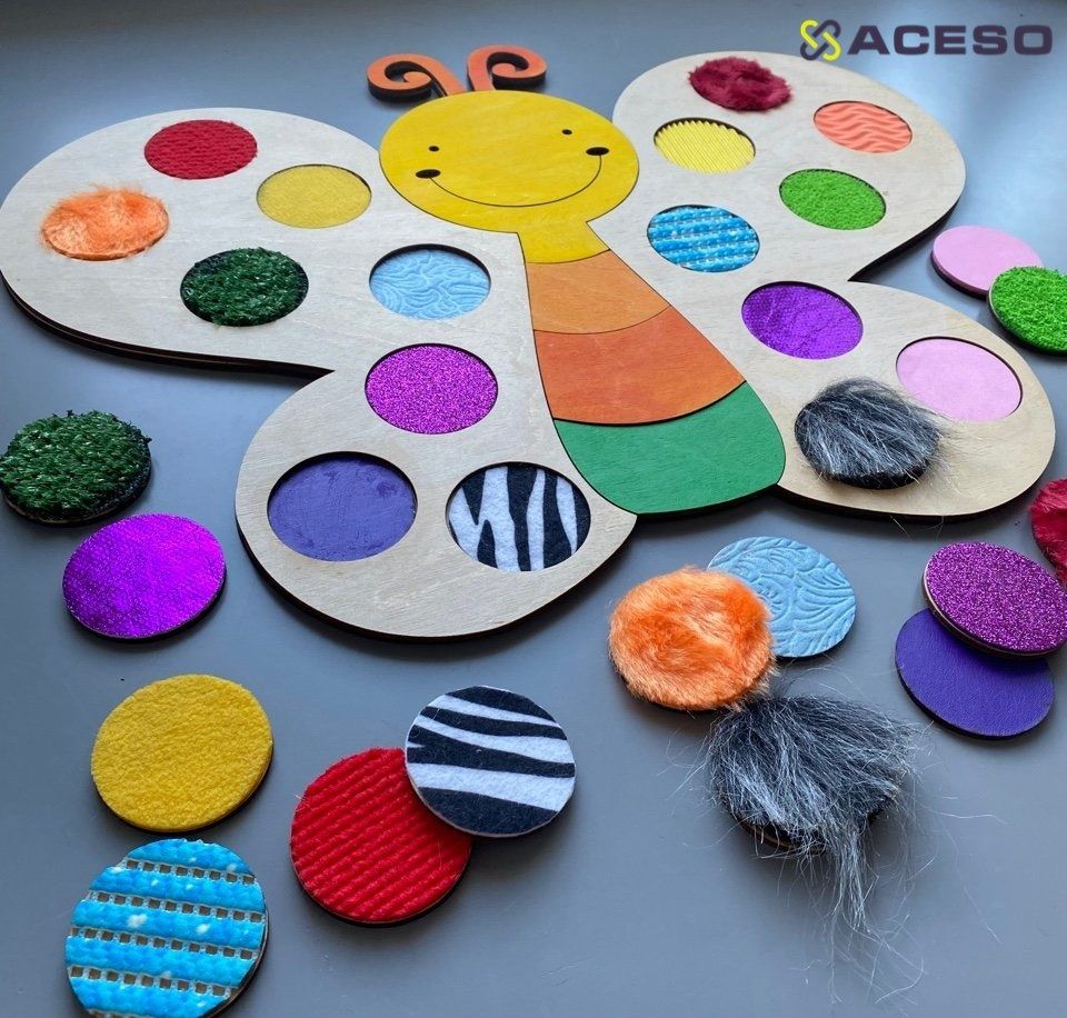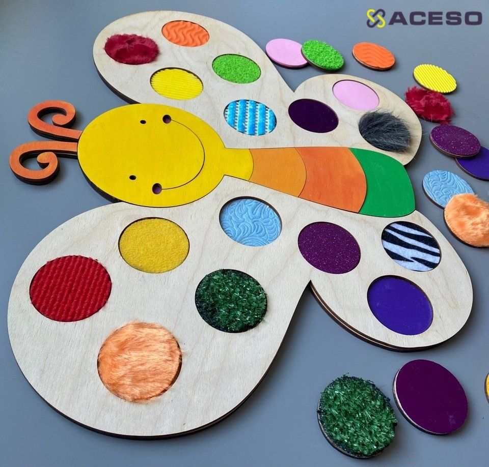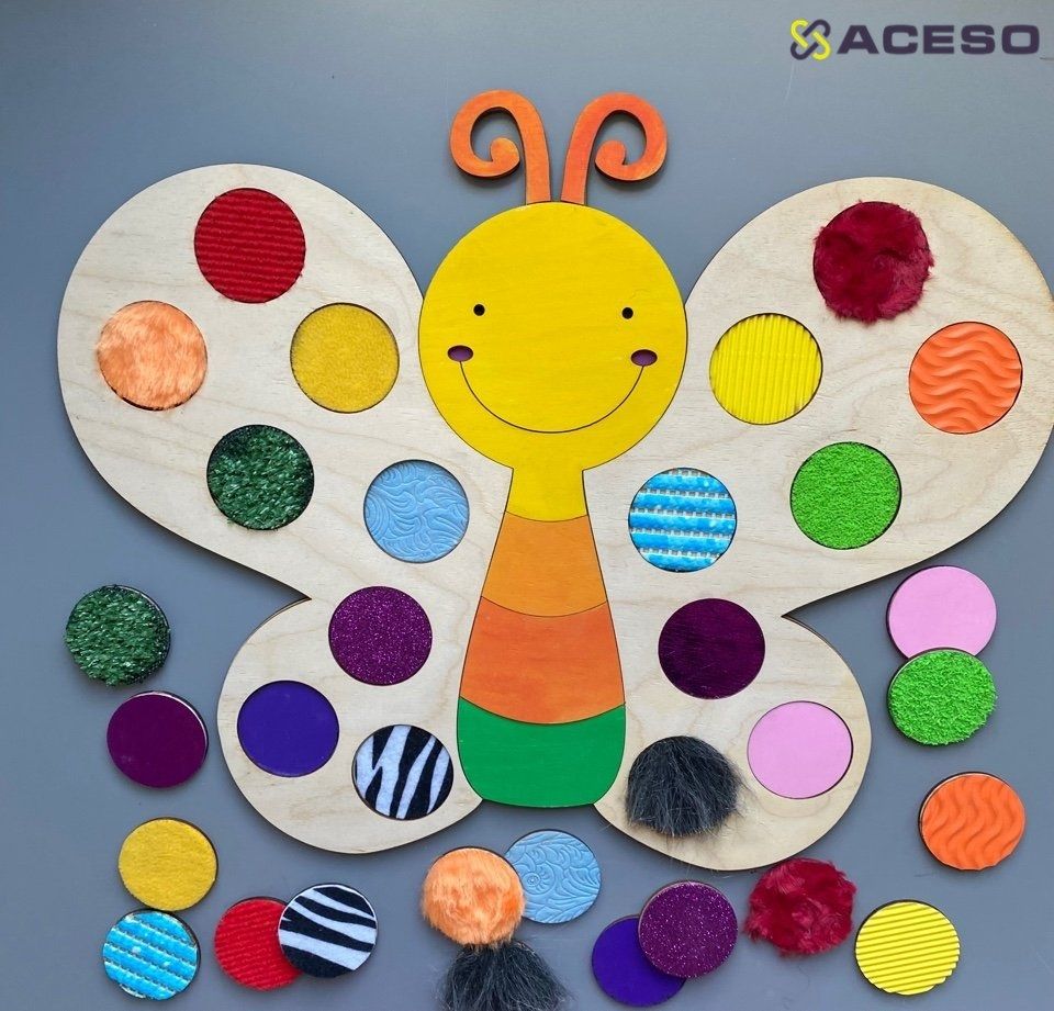 Можно играть разными способами:1. найти одинаковые по тактильным ощущениям предметы2. найти непохожие по тактильным ощущениям предметы.3. определение фактуры материала при прикосновении с закрытыми глазами.4. расположить предметы от самого гладкого к самому шершавому и другие способы игры.Игра выполнена из натуральных материалов – березовой фанеры. Размер бабочки 46х37см, диаметр кружочков 5 см.
