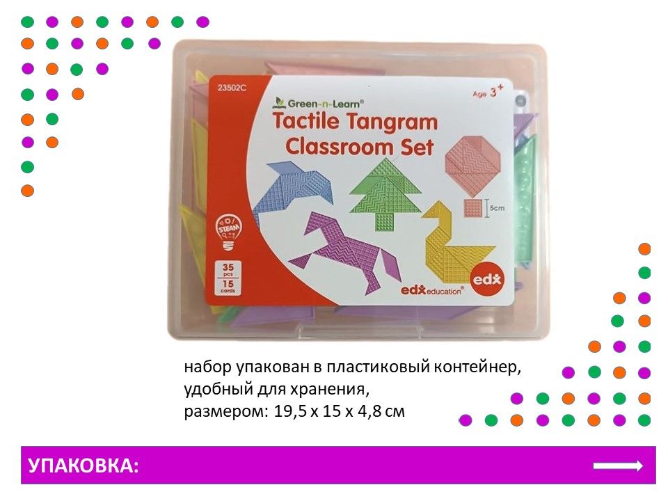 Танграм тактильный – увлекательная головоломка для развития логики и воображения! Набор включает 35 фигур с различными тактильными поверхностями в пастельных тонах, 15 двусторонних карточек с заданиями разного уровня сложности и пластиковый контейнер для хранения. Фигуры изготовлены из безопасного эко-пластика. С помощью этой игры ваш ребенок научится создавать целое из частей, разовьет тактильное восприятие и познакомится с основами геометрии.