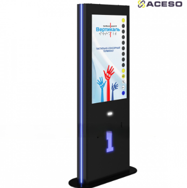 Тактильный информационный терминал «Tactile-VERT-1(43)V» с сенсорным экраном 43 дюйма и программным обеспечением для инвалидов. Предназначен для использования в качестве информационного носителя для всех категорий маломобильных групп населения: