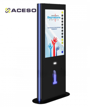 Тактильный информационный терминал «Tactile-VERT-1(43)V» с тактильным управлением для слепых людей, разработан специально для возможности его использования тотально слепыми и слабослышащими людьми, а также инвалидами-колясочниками в качестве информационного устройства. Терминал оснащен антивандальным стальным корпусом с контрастной контурной подсветкой.