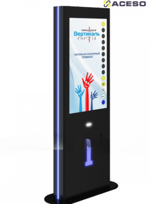 Тактильный информационный терминал «Tactile-VERT-1(43)V» с тактильным управлением для слепых людей, разработан специально для возможности его использования тотально слепыми и слабослышащими людьми, а также инвалидами-колясочниками в качестве информационного устройства. Терминал оснащен антивандальным стальным корпусом с контрастной контурной подсветкой.
